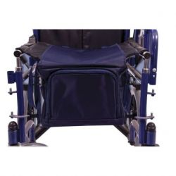 Bolsa debajo del asiento de nylon alcanzable por el usuario de la silla de ruedas desde la parte delantera. Fácil de anclar mediante correas. Color: azul oscuro. Dimensiones: Alto 30 x Ancho 40 x Fondo 28 cm.